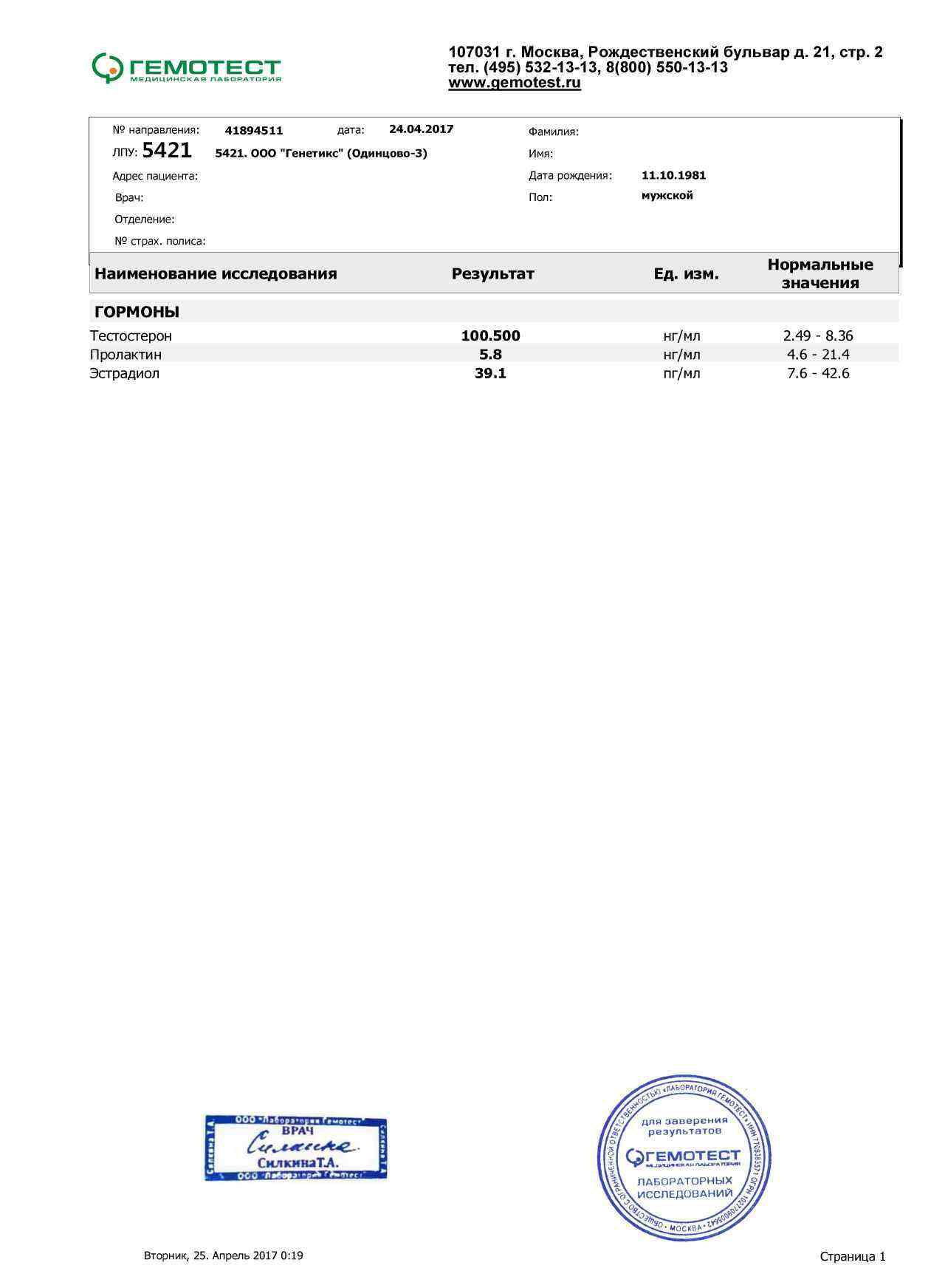Вчера сдал анализы, результаты прикрепляю ниже. На курсе принимал 1мг анастразола ч/д, каберголин 0,25 раз в 14 дней. Ставил суммарно 500мг/нед., разделенные на две инъекции по 250мг. Анализ сдан через 36 часов после инъекции 250мг. Что сказать, суст охуенин!